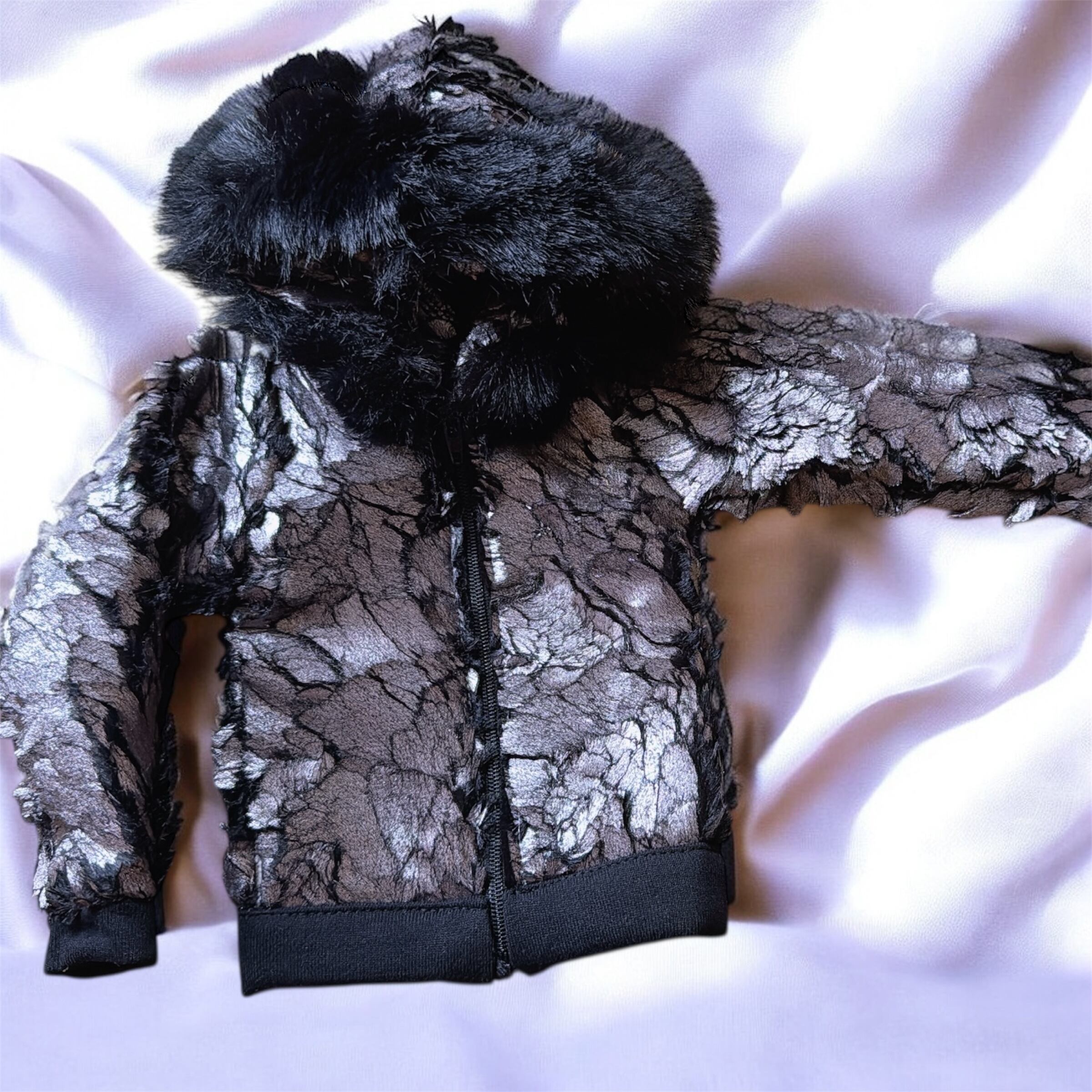 黒のフェイクファーにシルバーのインクで塗ってあるようなかんじ。